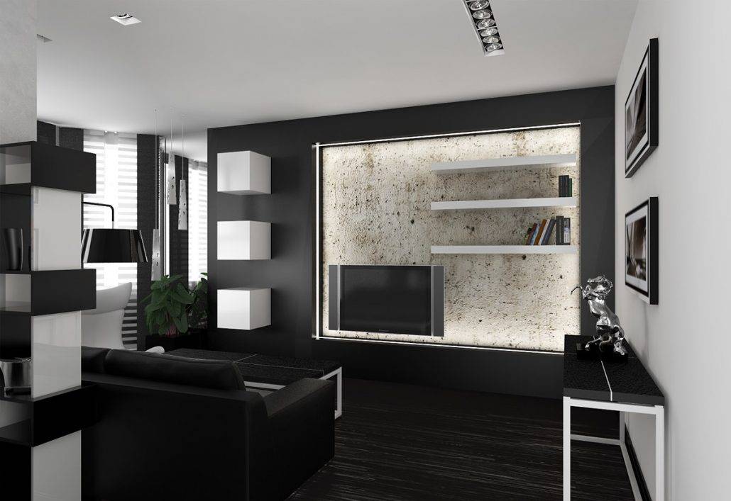 - Темная отделка торцов и контуров корпусной мебели, обеденного стола, ниши для телевизора и других функциональных конструкций придают пространству дополнительный объем.