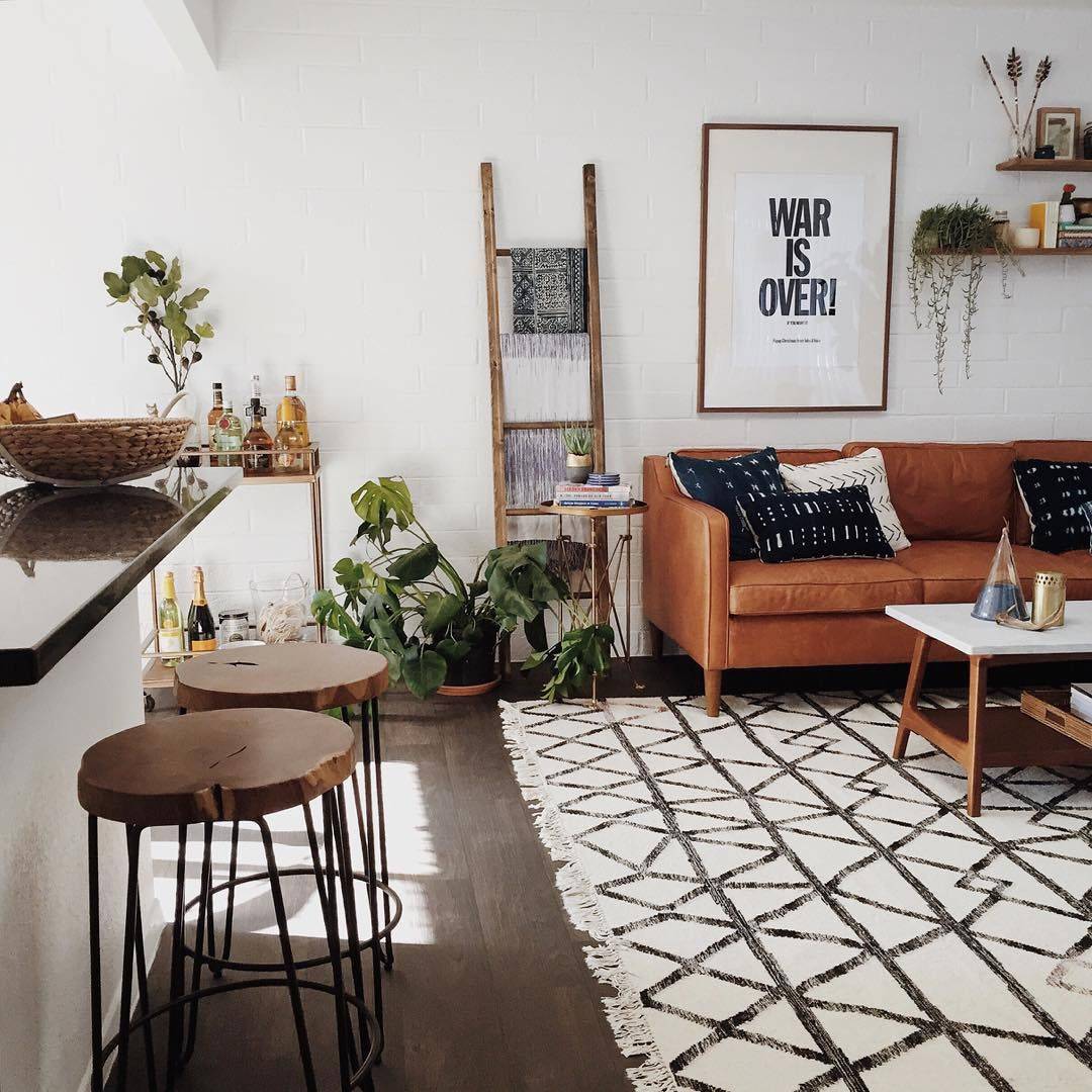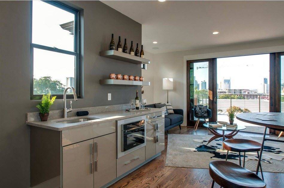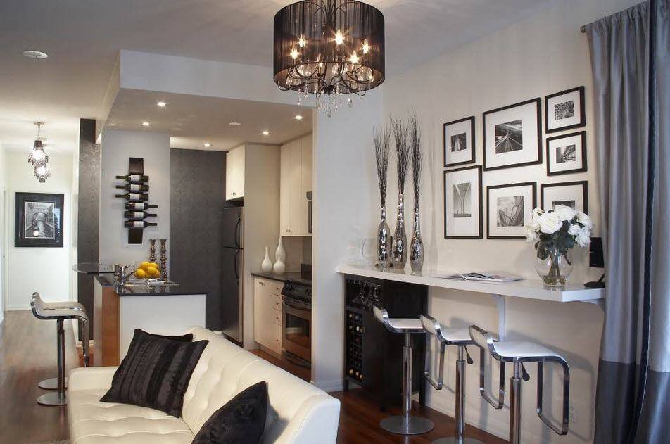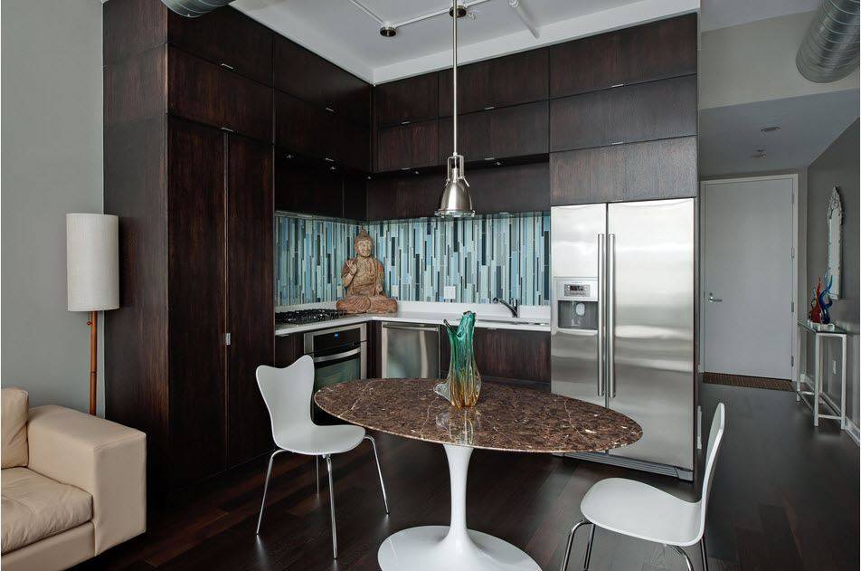 Возле барной стойки. Есть мнение, что такой вариант — для просторных кухонь-гостиных. Но пример ниже демонстрирует органику и с небольшой комнатой.