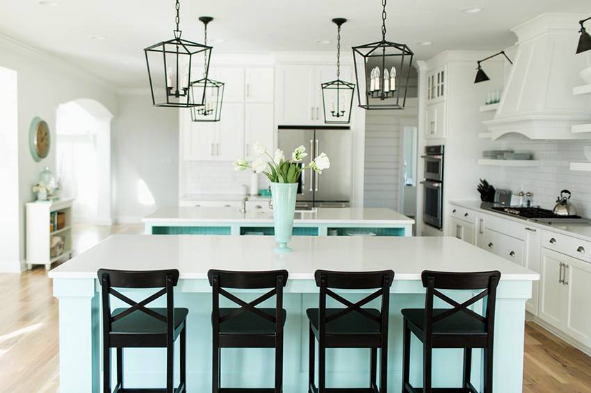 Использование этих цветов в интерьере позволяет визуально расширить тесное пространство. Легкий и воздушный стол пастельного оттенка не будет чрезмерно заполнять собой кухню и загромождать ее.