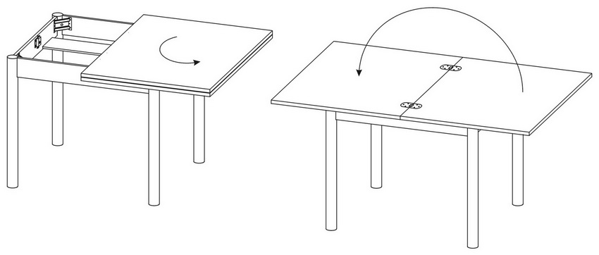 Существуют различные конструкции механизмов столов-трансформеров. При покупке по возможности обязательно проверьте, как работает тот, которым укомплектована понравившаяся вам модель. Проследите, чтобы он был удобен и полностью исправен, легко и без сбоев раскладывался и складывался назад.