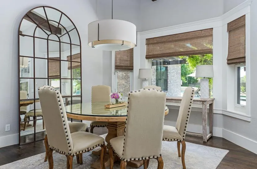 Классический стиль. Подойдёт мебель чётких геометрических форм и нейтральных оттенков. Любители эклектики могут попробовать сочетание разных направлений. Например, классический стол дополнят стулья в стиле ар-деко контрастной расцветки. Иногда достаточно выразительной детали: один из стульев с мягкой спинкой можно заменить креслом с обивкой капитоне.