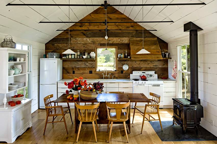 Лофт. В оформлении обеденной зоны на кухне в промышленном стиле не обойтись без мебели аскетичной формы с металлическим каркасом. Столешницу лучше выбирать деревянную; хорошо, если она сделана из цельного среза (слэба). Стулья могут быть разными по исполнению; их может дополнить кожаный диванчик.