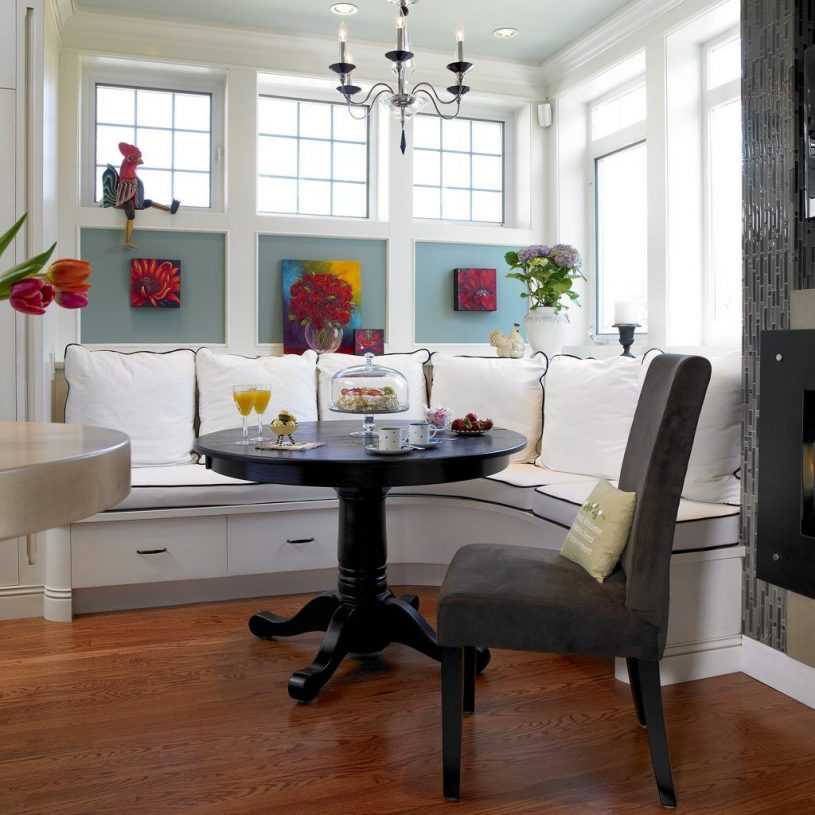 При выборе лучше обратить внимание на конструкцию с раскладным столом, габариты которого могут регулироваться с учетом количества человек. Идеально впишется в комнату небольшой линейный или трехместный угловой диванчик с круглым столом