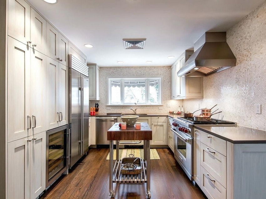 П-образная кухня по функциональности напоминает предыдущий вид. Ее главное преимущество – много места для вещей и техники. Однако для рационального использования пространства необходима длина стен от 1,5 до 2,5 метров.