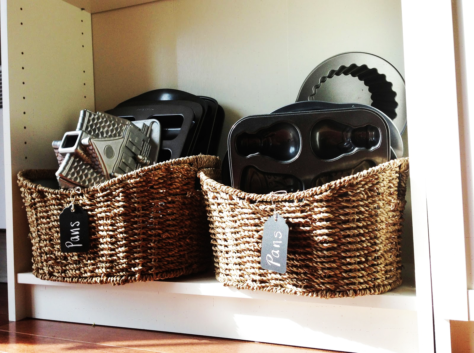 Под хранение форм и инструментов для выпечки используют наборные корзинки. При желании их можно сделать самостоятельно из тонкого ротанга или другого материала. Коробки из-под обуви использовать нежелательно, так как они быстро размокнут и потеряют свою функциональность.