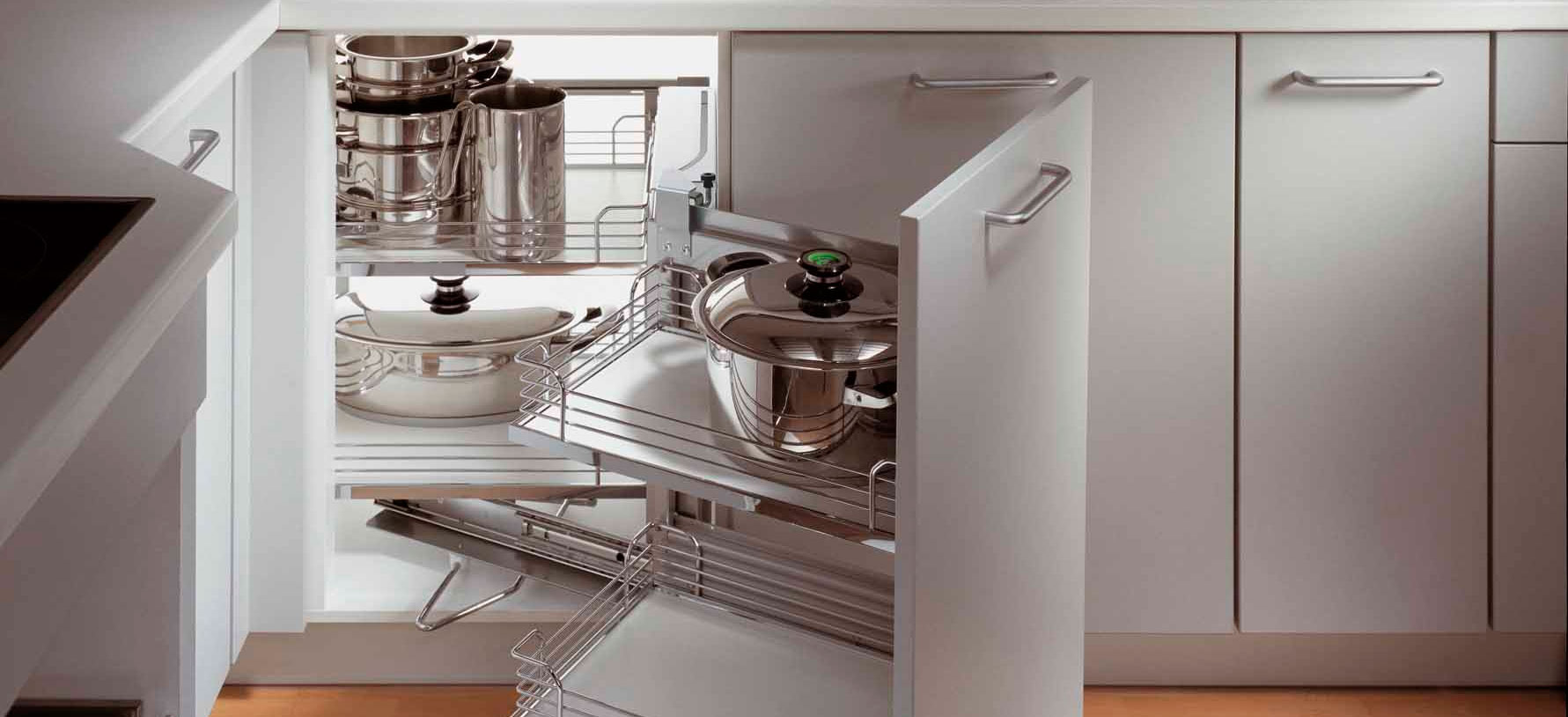 Производители современных кухонь выпускают еще и так называемые скрытые выдвижные системы. Они позволяют рационально использовать труднодоступные места и глухие углы в кухне.