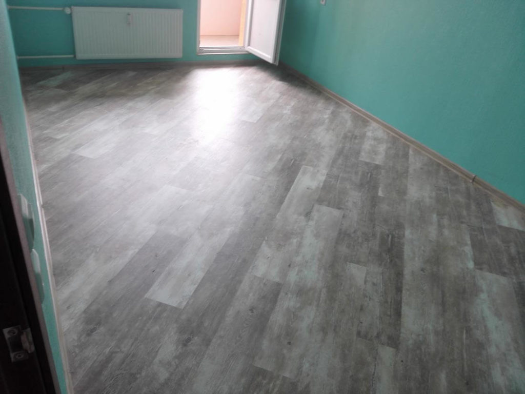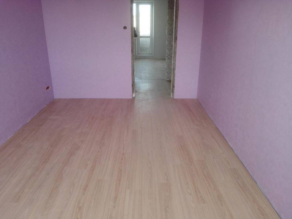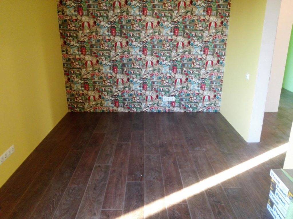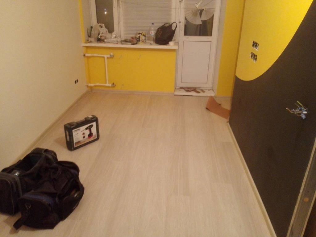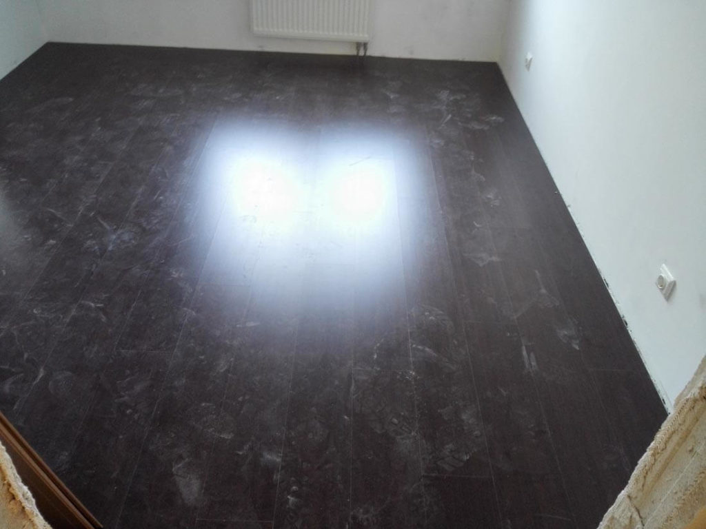 Шаг 1. Так как этот тип покрытия довольно требователен к ровности основания, то оно хорошо очищается от мусора, при необходимости подвергается выравниванию при помощи самовыравнивающихся смесей или фанеры (также может использоваться гипсокартон и другие подобные материалы). Ровность основания проверить легко – для этого используется длинный уровень, который укладывается на пол, далее оценивается возможный зазор между ним и черновым основанием. Максимально допустимый размер зазора составляет всего 2-3 мм. Также ровность основания может определяться при помощи угольника и лазерного уровня. Высота от пола до уровня прохождения луча должна быть одинаковой везде. После этого пол может быть сразу покрыт грунтовкой.