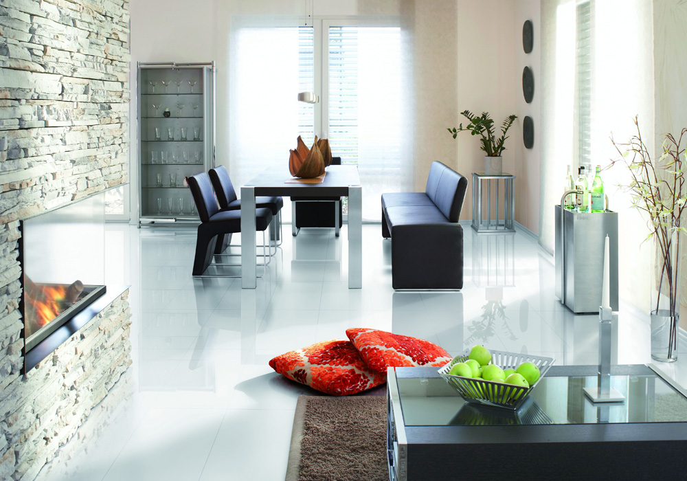 Хорошим решением станет также выбор ламината для всей квартиры. По своим свойствам он почти не уступает дереву, при этом можно выбрать интересные дизайнерские решения. Например, для гостиной можно использовать белый глянцевый ламинат: он будет расширять пространство, при этом из-за отражения предметов светлые потолки будут казаться выше, чем на самом деле, и в целом в комнате будет визуально светлее.