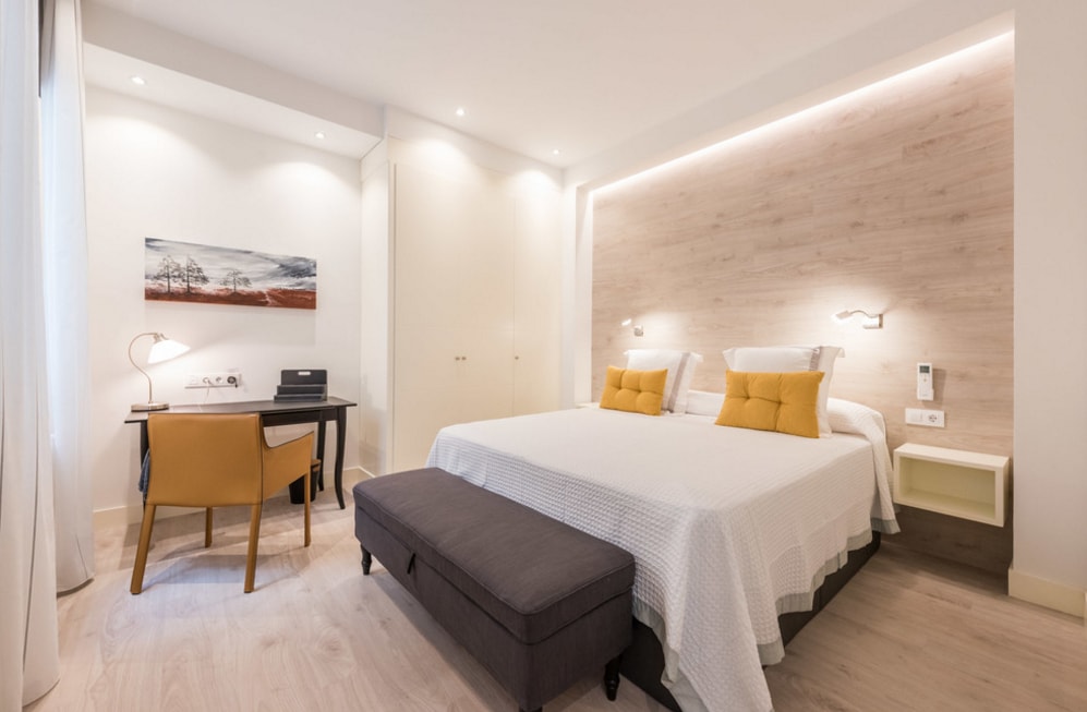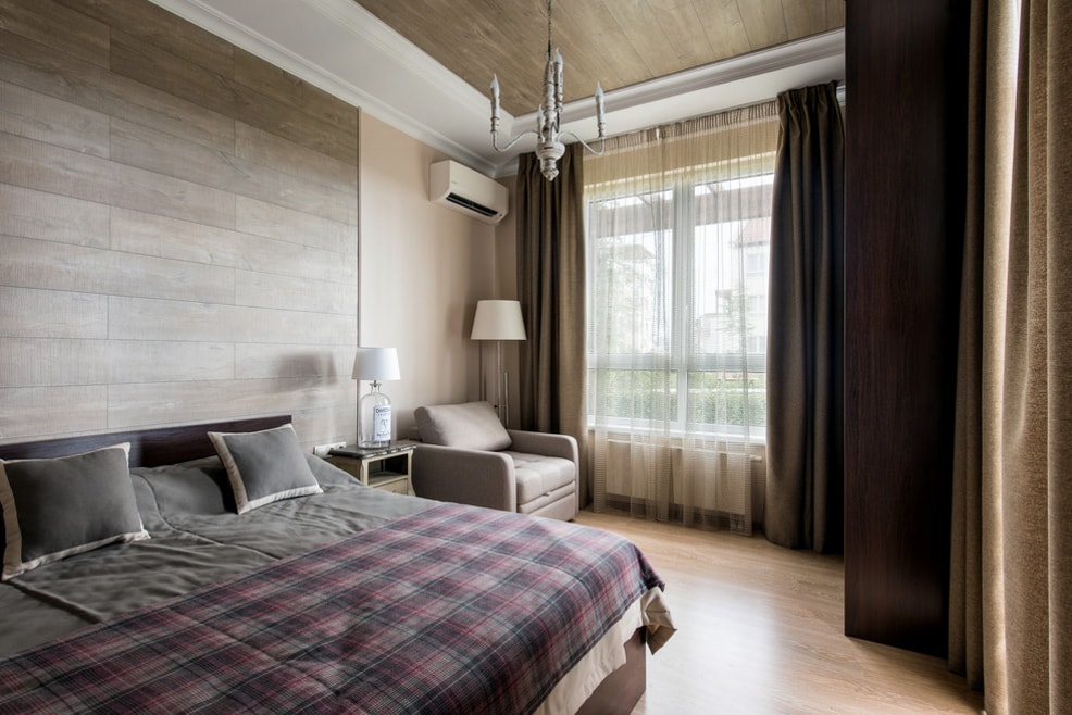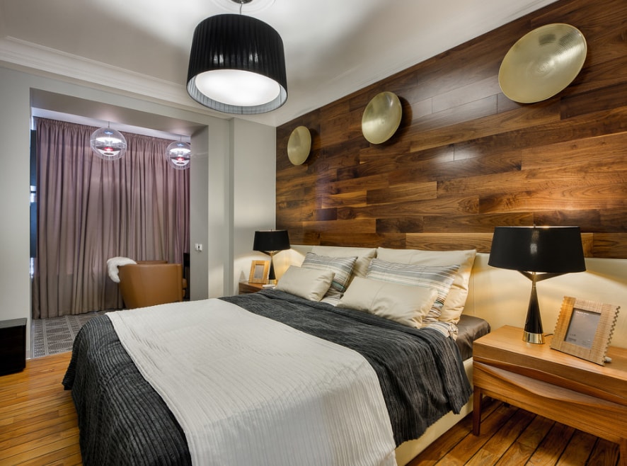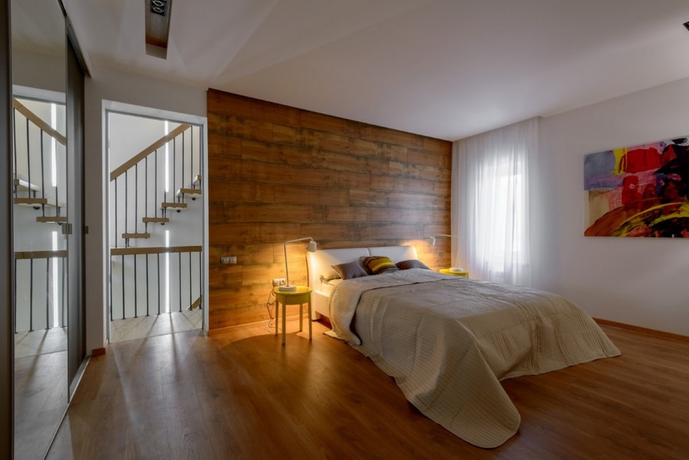 Дизайн спальни, со стеной отделанной ламинатом, выделяется своей новизной и современностью на фоне других устаревших вариантов отделки. Посмотрите сами.