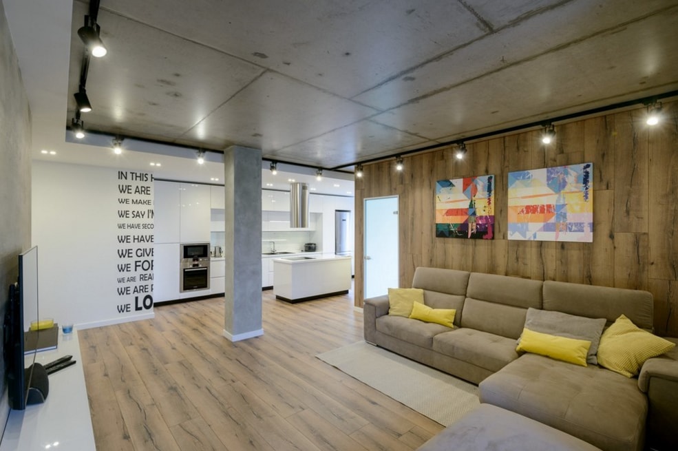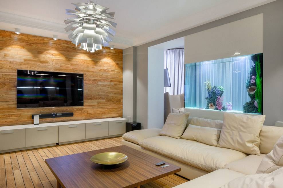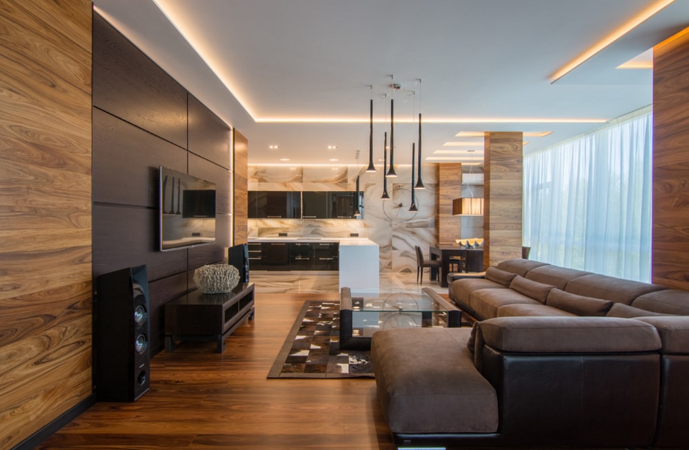 Стена из ламината в зале дополнительно облагораживает это и без того значимое помещение. Вы можете убедиться в этом наглядно ниже.