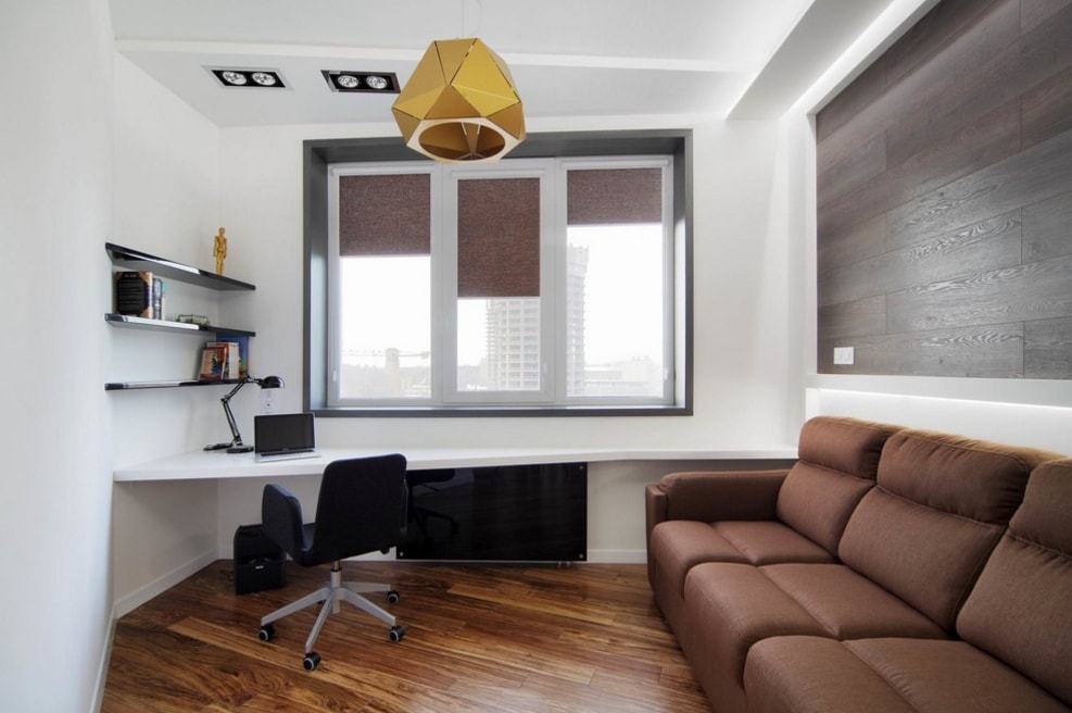 Но чаще дизайнеры предпочитают отделку одной из них. Остальные окрашивают или оклеивают обоями более спокойных, как правило, светлых оттенков. Облицевать можно также фрагмент стены.Можно оформить стену в изголовье спального места, украсить пространство за телевизором (позволяет не только зонировать помещение, но и скрыть за панелями провода), отделать вставкой из ламината рабочее место или детский уголок, просто визуально разделить функциональные зоны помещения.