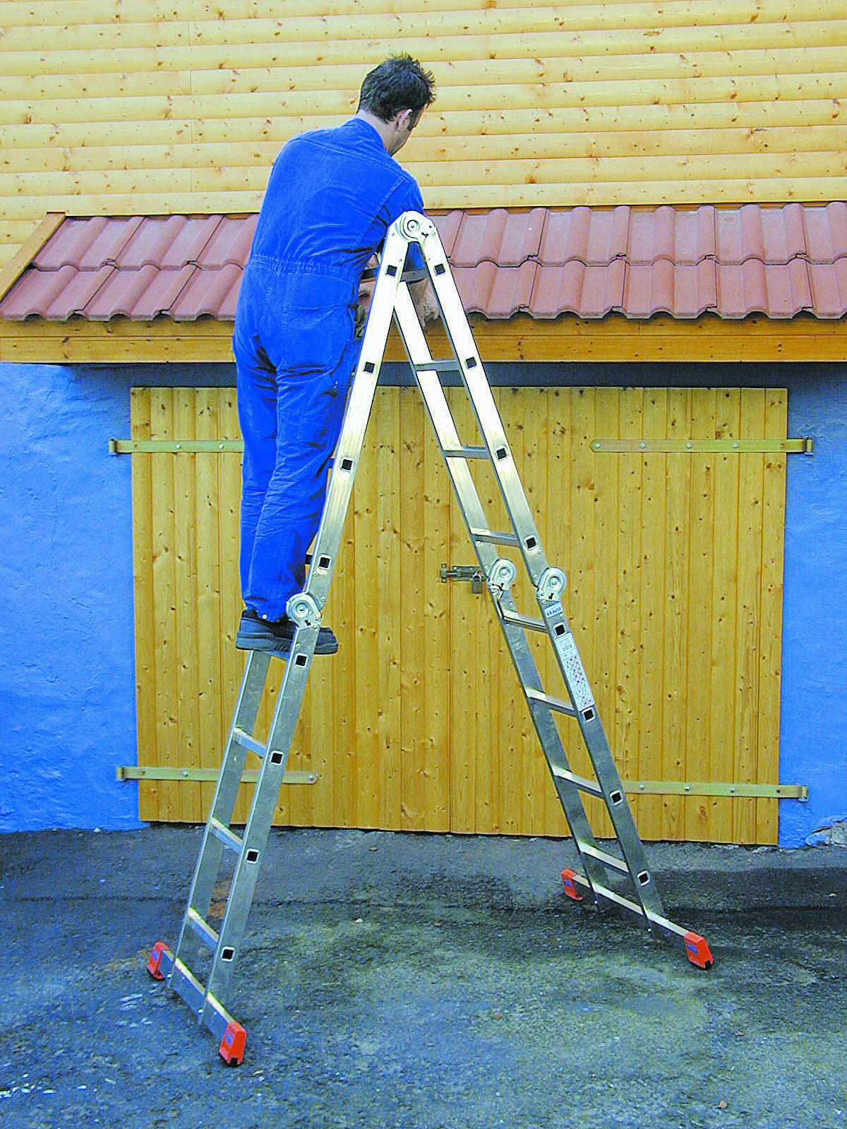 Стандартные алюминиевые лестницы (4х4) имеют 4 секции и одинаковое количество шагов. Для повышения устойчивости предусмотрены замки-фиксаторы, которые обеспечивают форму лестницы в любой из вышеуказанных форм. С обоих краев лестницы предусмотрены ножки с прорезиненными элементами, предотвращающие случайное скольжение.
