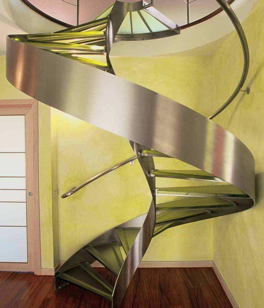 Винтовой тип лестницы напоминает структуру человеческого ДНК и имеет значительно меньшие габариты, но при этом такую лестницу сложно сочетать с интерьерами в классическом стиле. Винтовая лестничная конструкция имеет один пролет закрученной формы и особо подходит для небольших помещений. Отметить стоит, что пространство при появлении такой лестницы сразу же приобретает необычный вид, наиболее уместный для модерновых интерьеров или выполненных в грубом средневековом стиле. Стеклянные винтовые лестницы отлично впишутся в интерьер стиля хай-тек. Винтовые лестницы обладают опорой, ступеньками, балясинами и перилами. Лестницы такого типа редко выполняются из камня, но такой вариант гармонично смотрится с урбанистичным дизайном или интерьером, выполненным «под старину». Каменные конструкции рекомендуется совмещать с коваными перилами, но такой тип лестницы подходит только для масштабных пространств. Винтовые лесенки открытого вида, без подступенка, выглядят воздушно и крайне оригинально.
