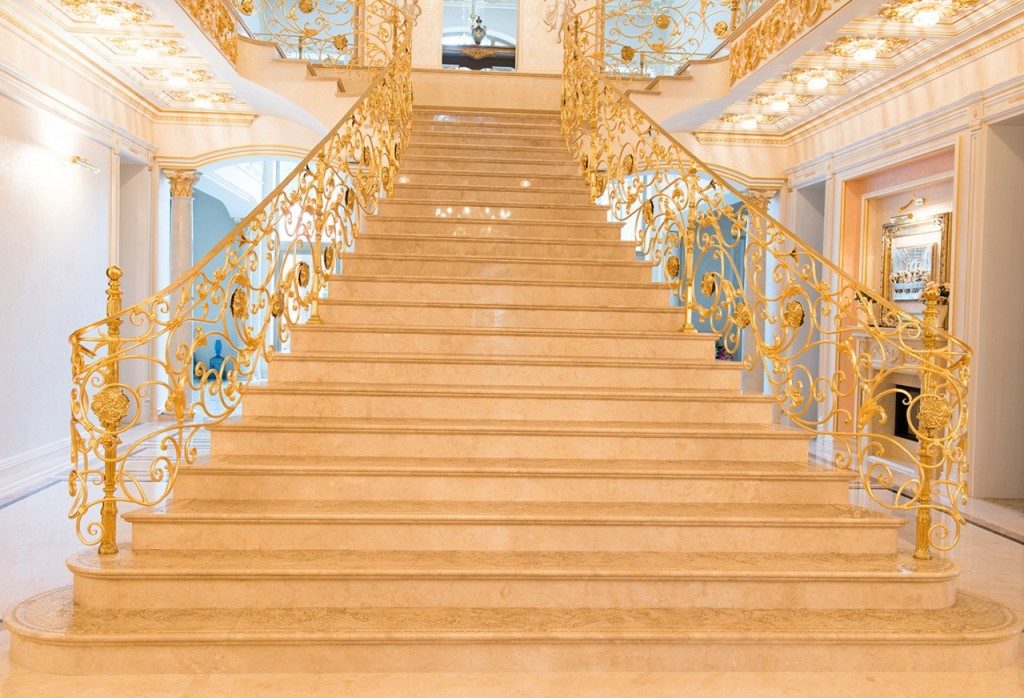 Посмотрите на фото выше. Это дизайн лестничной площадки в респектабельном частном доме. Сам пролет из ценной древесины, а площадка – словно зал во дворце римского патриция: барельефы из камня, мраморный пол, изукрашенные стены и световые столбы (свето-музыкальная инсталляция). Конечно, дизайн этого интерьера уже не назовешь просто площадкой, но тем не менее это она.
