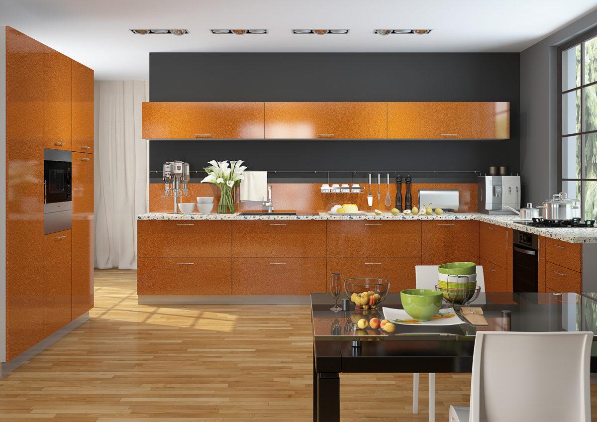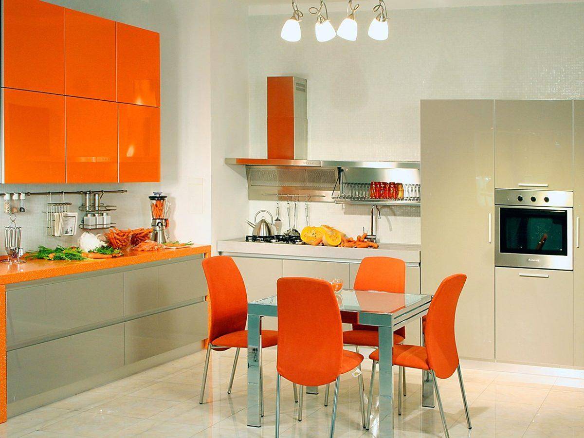 Интерьер оранжевой кухни во многом зависит от элементов отделки, декора, установленной мебели.