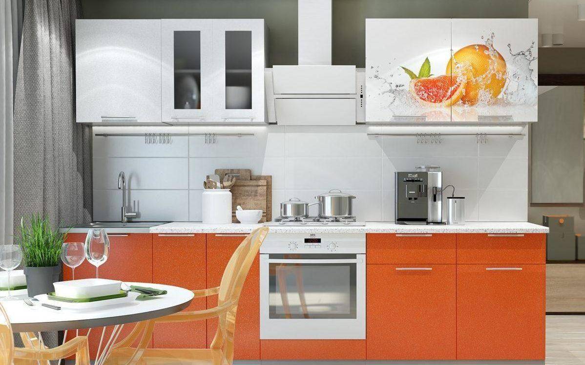 На фото бело-оранжевый кухонный гарнитур буквой п с фартуком, оформленным стеклянным скинали с фотопечатью.