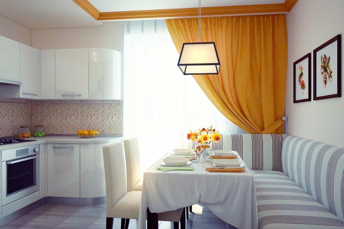 Место, где принимают пищу, состоит из стола, который в целях экономии пространства делают округлым, нескольких стульев или кухонного диванчика. Если столик, стулья поставить стеклянные, они будут малозаметными, что придаст интерьеру легкости, воздушности. Столовая зона украшается 3D-наклейкой с изображением второго окошка, пейзажа, натюрморта, декоративными блюдцами, небольшим резным панно. Иногда на уровне столешницы в обеденной зоне размещают большое зеркало, что существенно расширяет пространство.