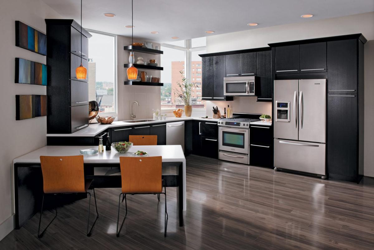 Важно, чтобы темный тон не преобладал над другими и не подавлял их. Визуально увеличить пространство можно, используя белый фартук.