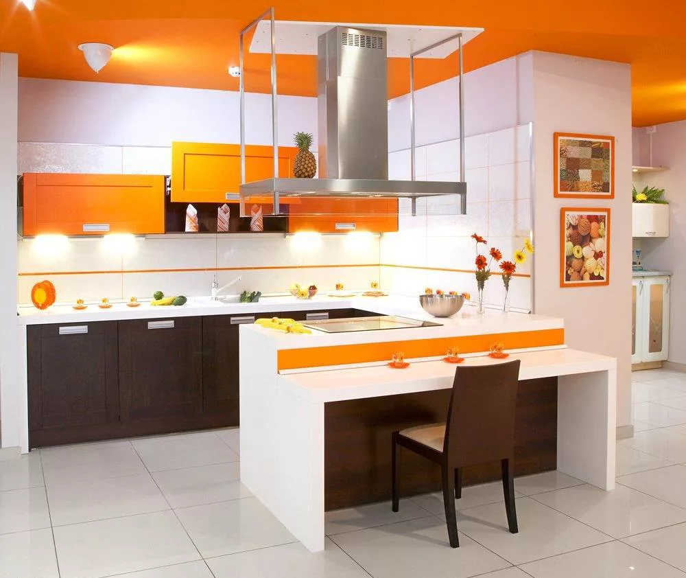 Между выбором декора и насыщенностью цвета существует прямо пропорциональная зависимость. Чем современней интерьер кухни в оранжевом цвете вы хотите использовать, тем ярче должны быть задействованные в нем оттенки. К примеру: