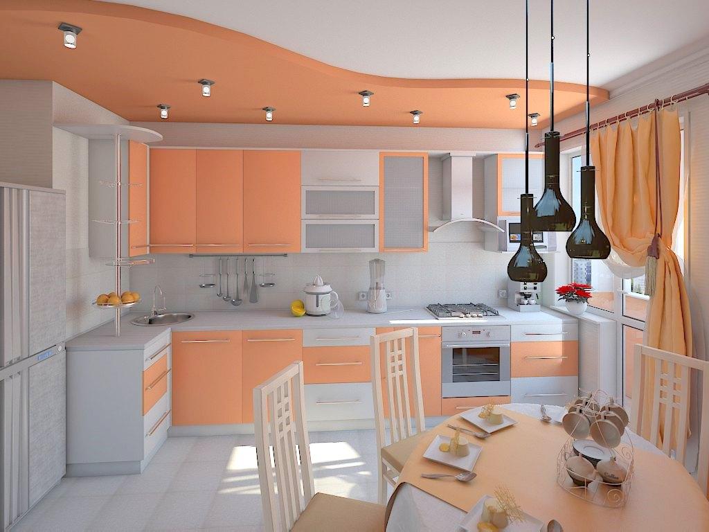 Интерьер кухни в апельсиновой гамме нуждается в большом количестве освещения. Таким образом обстановка становится еще ярче и жизнерадостней. Оптимальным решением является установка точечных светильников в комбинации с люстрой. Осветительные приборы в сочетании с глянцевыми поверхностями максимально расширят небольшое пространство и наделят его светом.