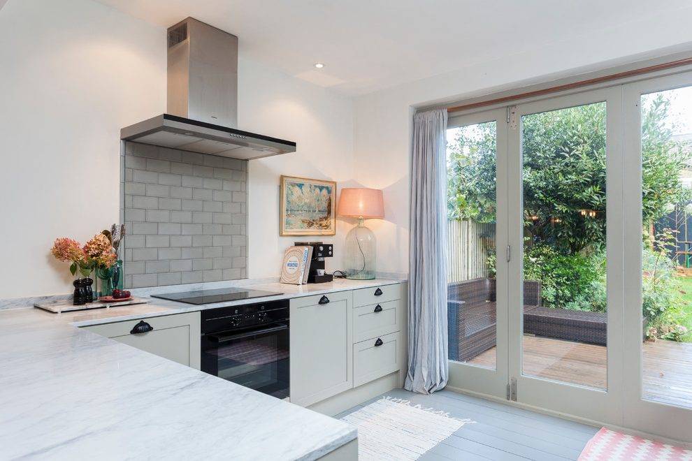 Для комнаты, оформленной в морском стиле, подбирают гардины двух цветов: песочно-желтый и морская бирюза. Оба оттенка часто используются в интерьерах пляжных домиков. Бирюзовая плитка на кухонном фартуке и белоснежный мебельный гарнитур дополнят композицию.