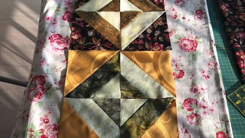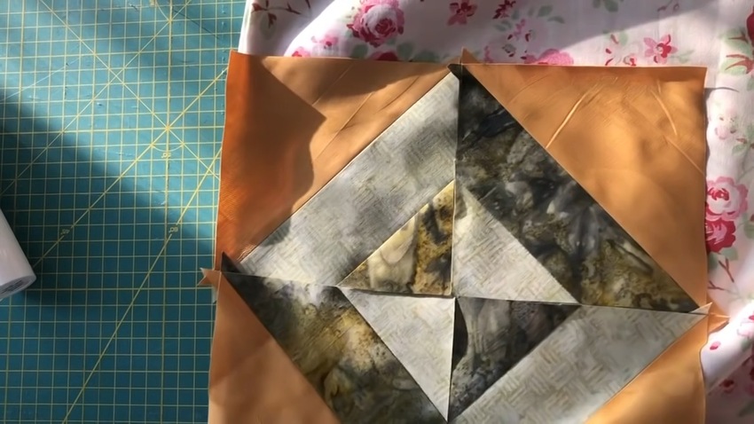| 4 | ![]() | Каждый треугольник разверните, тщательно разгладьте диагональный шов и разложите их лицевой стороной вверх, собрав своеобразный рисунок. С каждого блока срежьте уголки. |