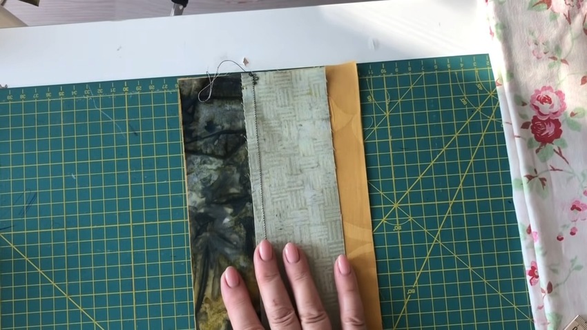 | 2 | ![]() | Наложите сшитую полосу на цельнокройный отрез шириной 11 см и прострочите по краям, делая отступ 1 см. После этого снова хорошо прогладьте утюгом заготовку. |