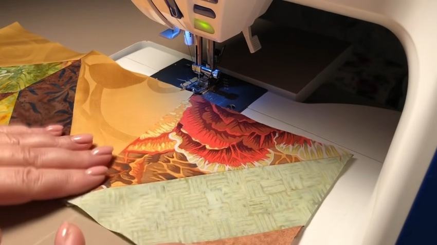 Определившись с техникой и схемой выполнения, мастерица подготавливает заготовки для лоскутного шитья по лекалам и приступает к шитью.