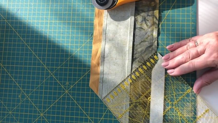 | 3 | ![]() | Затеи необходимо вырезать одинаковые блоки треугольной формы. Для этого лучше использовать трафарет или линейку, на которой удобно отметить скотчем угол 45°. |