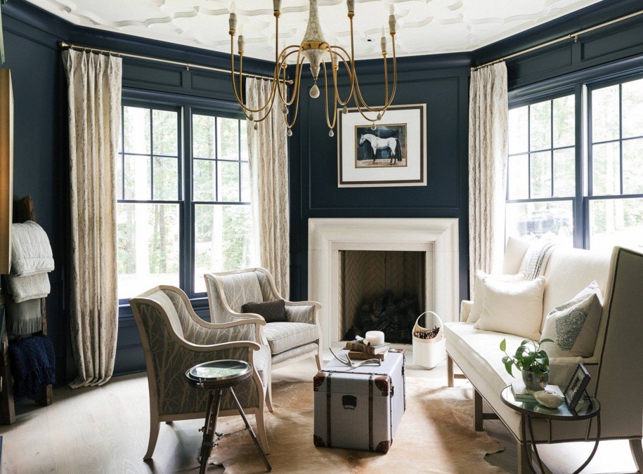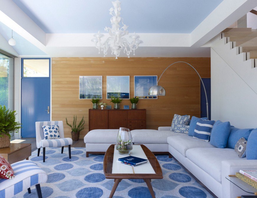 Если рожки направлен на стены, гостиная расширяется, такой приём используют в небольших комнатах. Освещение сильнее и равномернее.