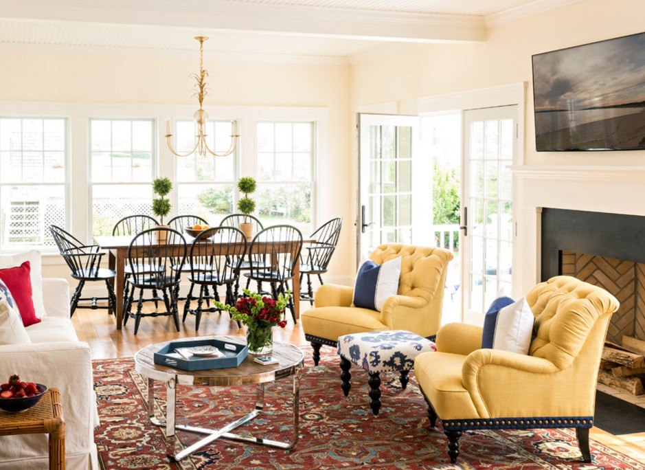 Абажуры, направленные вниз, дают более концентрированный круг света, чего не хватит для большой площади. Такой вариант станет удачным, если разместить люстру над столом, например, выделив таким образом обеденную зону. Но могут понадобиться и дополнительные приборы в других частях гостиной.