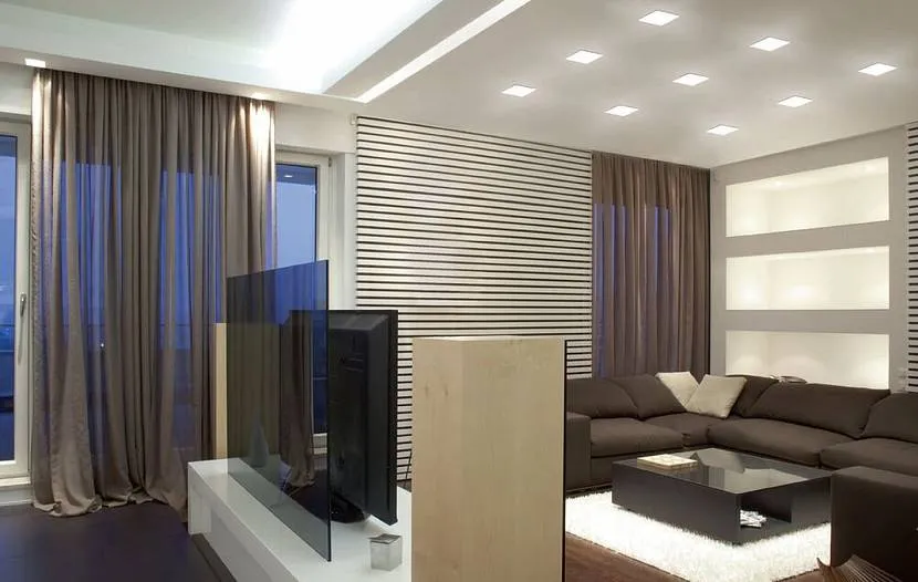 - Комплектующие системы освещения адаптированы для установки на натяжном потолке гостиной.