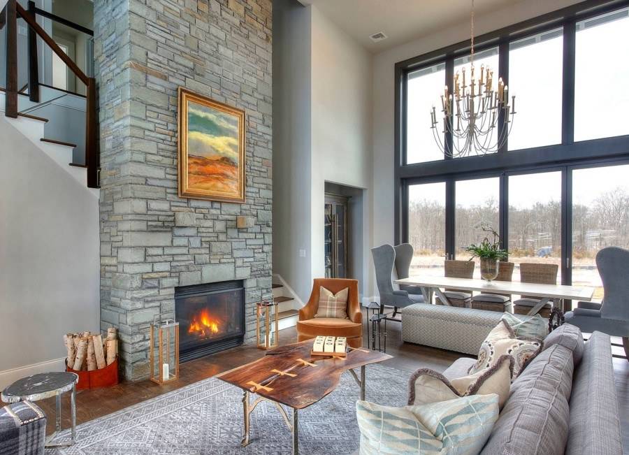 Устанавливают конструкцию по центру целевой зоны. Так, если комната невелика, люстру закрепляют над обеденным столом в гостиной или кофейным. Если зал большой и объединяет несколько зон отдыха и рабочий кабинет, центральный осветительный прибор монтируют над главной группой, например, над диванным уголком с телевизором.