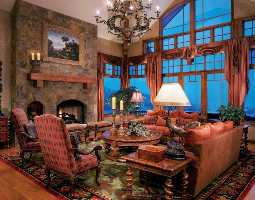 Камин в зале способен повлиять на выбор светового источника. Например, в комбинации с классическим порталом будет выгодно смотреться кованое изделие со свечами, стилизованное под канделябр.