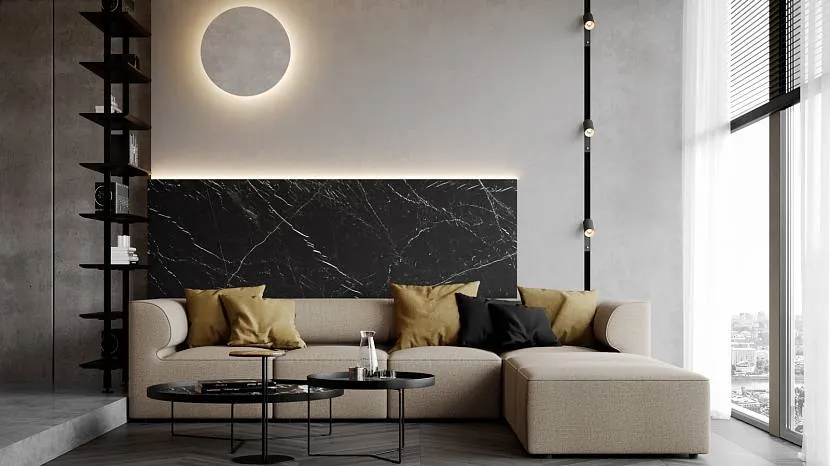Дизайнерский прием подчеркивает декор, форму и размеры гостиной. В помещении используют игру тени и света, лучи разных цветов и температур