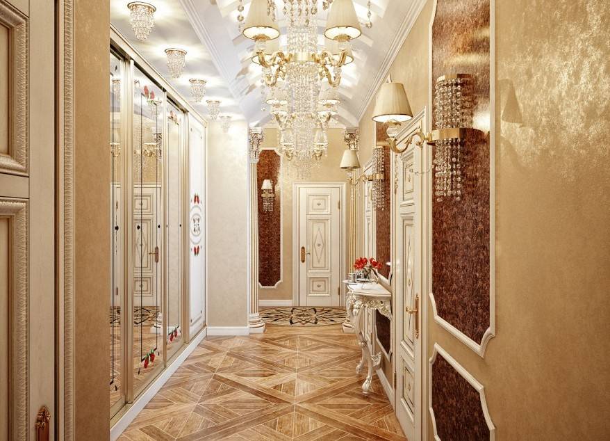 В квадратной прихожей или коридоре такой конфигурации в качестве основного источника света часто используют классические центральные люстры. При выборе стоит учесть стиль интерьера.