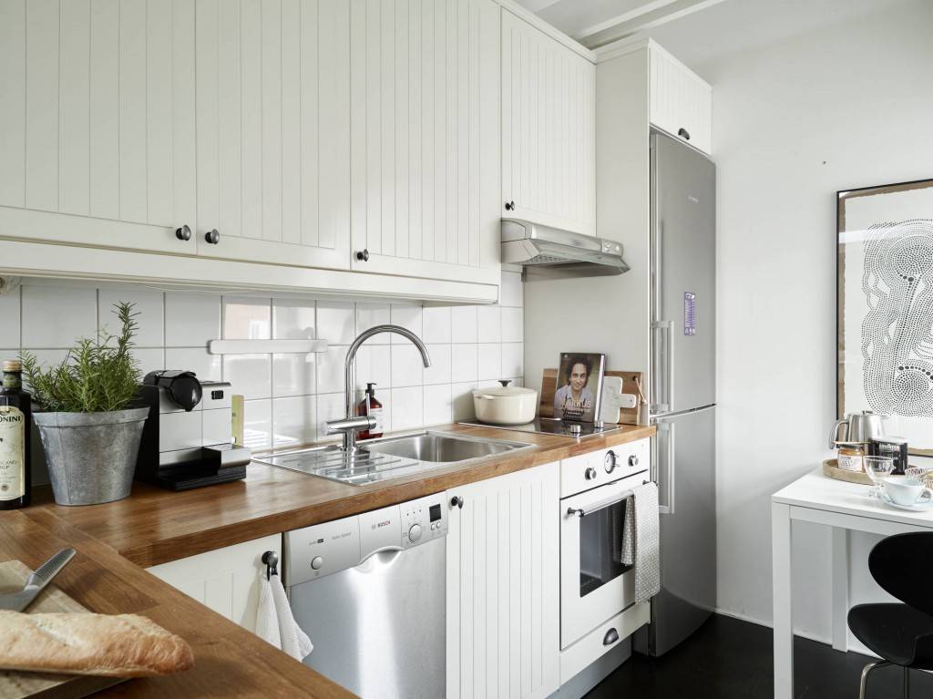 Но места для перемещения останется совсем мало, и разминуться будет довольно сложно. Да и стандартных 50-60 см рабочей поверхности не всем достаточно для полноформатной готовки. Поэтому большой популярностью пользуется идея переноса некоторых обитателей кухни – холодильника, стиральной машины и газовой колонки.