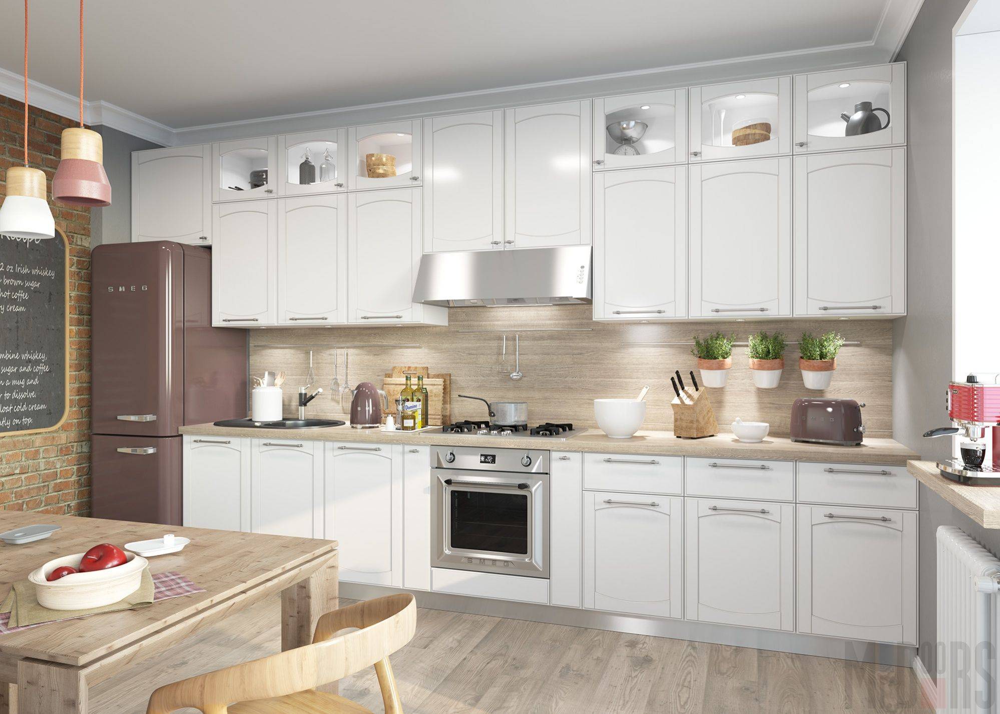 Гарнитуры в этом стиле по большей части матовые, с красивыми фрезеровками: да, они не будут отражать свет, но и выглядеть громоздко также не будут — благодаря белому цвету
