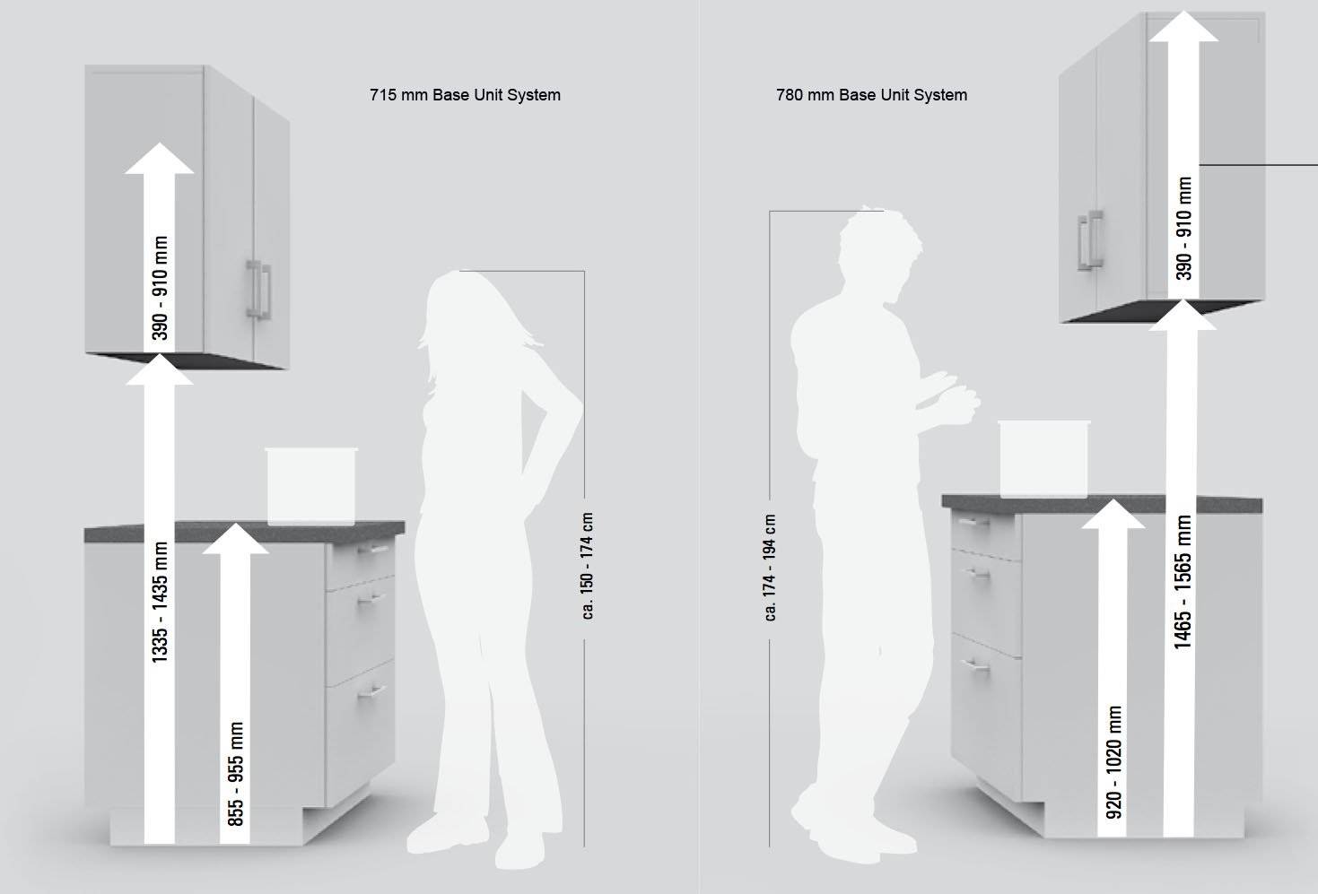 Навесной кухонный сервант по стандарту размещается так, чтобы нижний рубеж находился в 130–160 см от пола. Расчёт проводится так же, как и с тумбами, зависимо от роста хозяев, личных пожеланий. Обязательно учитывается высота самих антресолей, чтобы рука легко дотягивалась до верхней полки.