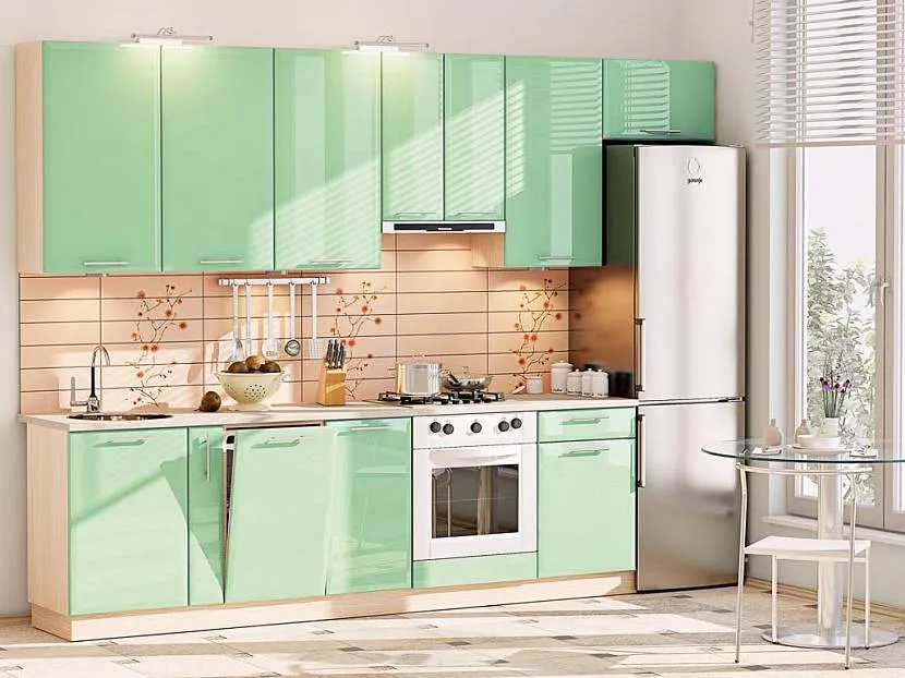 Линейные кухни располагают на одной линии. Здесь экономится площадь помещения и проще обустроить разные зоны. При выборе модели достаточно знать длину стены и желаемую глубину мебели. Такие гарнитуры очень практичны – все находится под рукой, а на приготовление пищи тратится меньше времени.