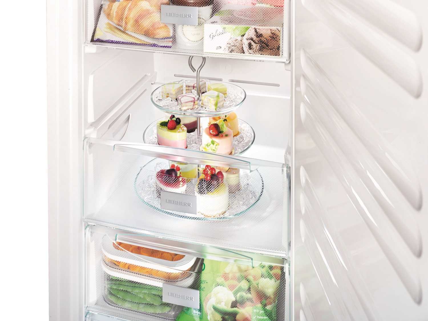 - Libherr UIK 1424. Двухкамерное оборудование (холодильник + морозилка). Очень маленький, оснащен выдвижными полками и автодоводчиком. Работает тихо, в качестве дополнительной функции имеет возможность сверхохлаждения. Минус заключается в капельной системе охлаждения морозильной камеры;