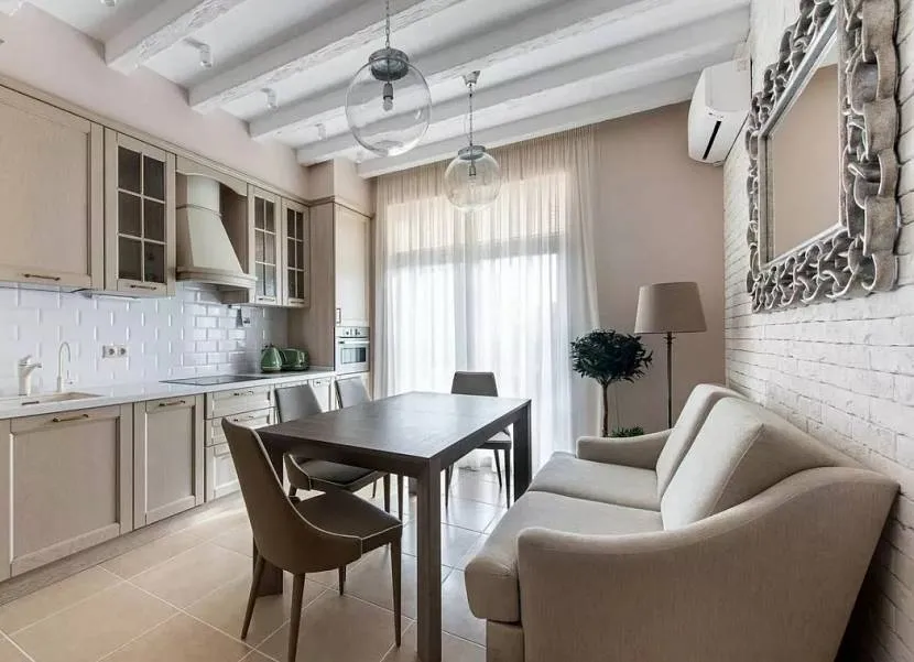 Современный минимализм с нейтральным декором обеспечит порядок в помещении. Его отличия — отсутствие лишних деталей, натуральные материалы, лаконичная техника.