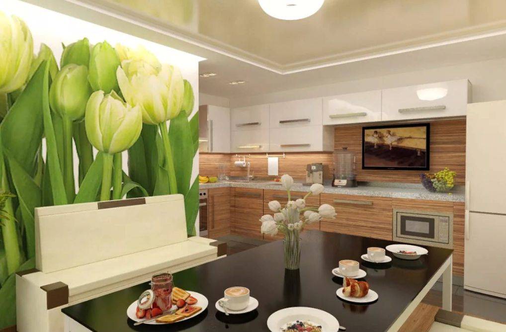 Просто поставить красивый диван на кухне недостаточно для создания привлекательной, уютной атмосферы. Сделать интерьер оригинальным помогут дополнительные украшения. Качественно выделить зону отдыха можно необычными фотообоями. Фотообои стоят недорого, их легко наклеить на стену самостоятельно. Рисунок фотообоев может быть разным: абстрактным, пейзажным. Главное – он должен настраивать человека на релакс, не иметь слишком мелких деталей. Мелкие рисунки отвлекают, будут мешать отдыху