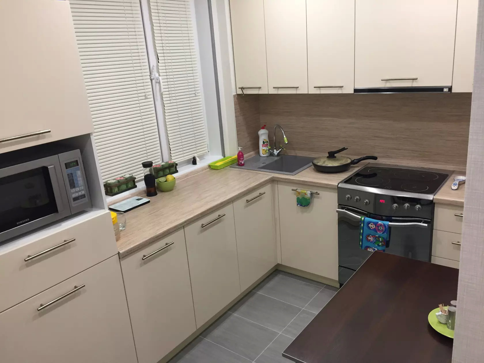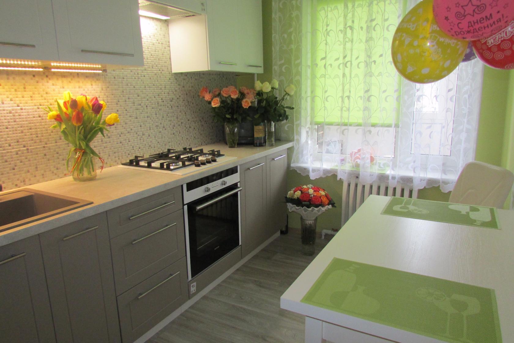 В малогабаритку органично впишется прямая конструкция. Благодаря расположению вдоль одной стены, получается значительно увеличить зону приготовления пищи. Лучше всего установить прямую модель возле самой длинной стенки. Придется совершить перенос коммуникаций, но зато удастся сохранить свободные квадратные метры.