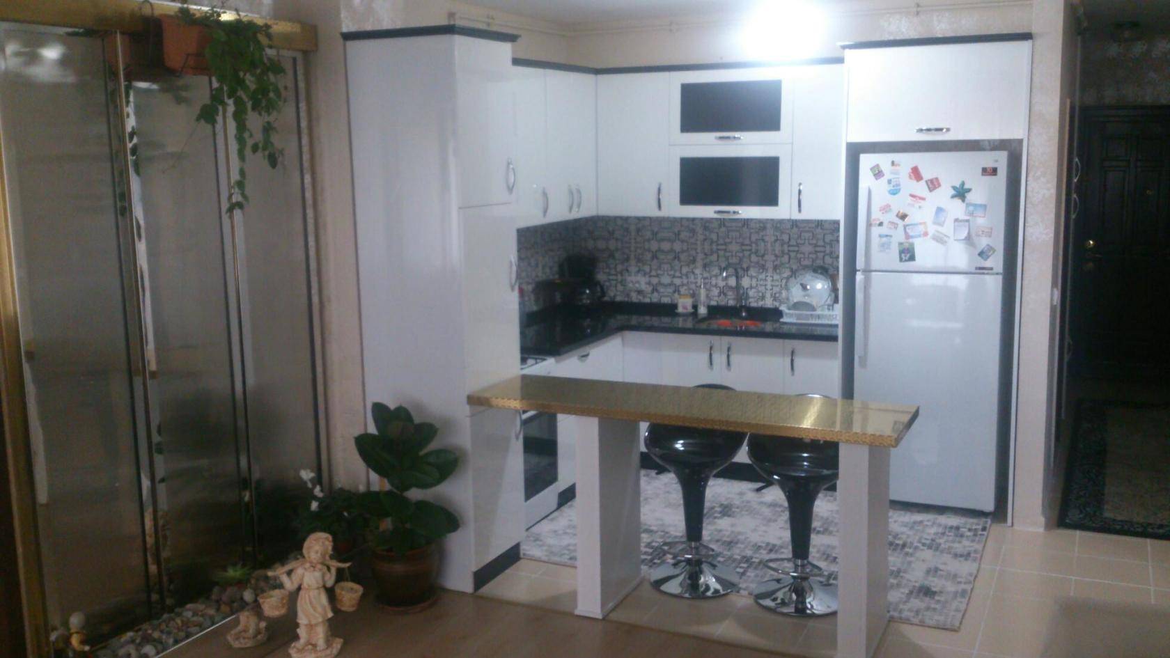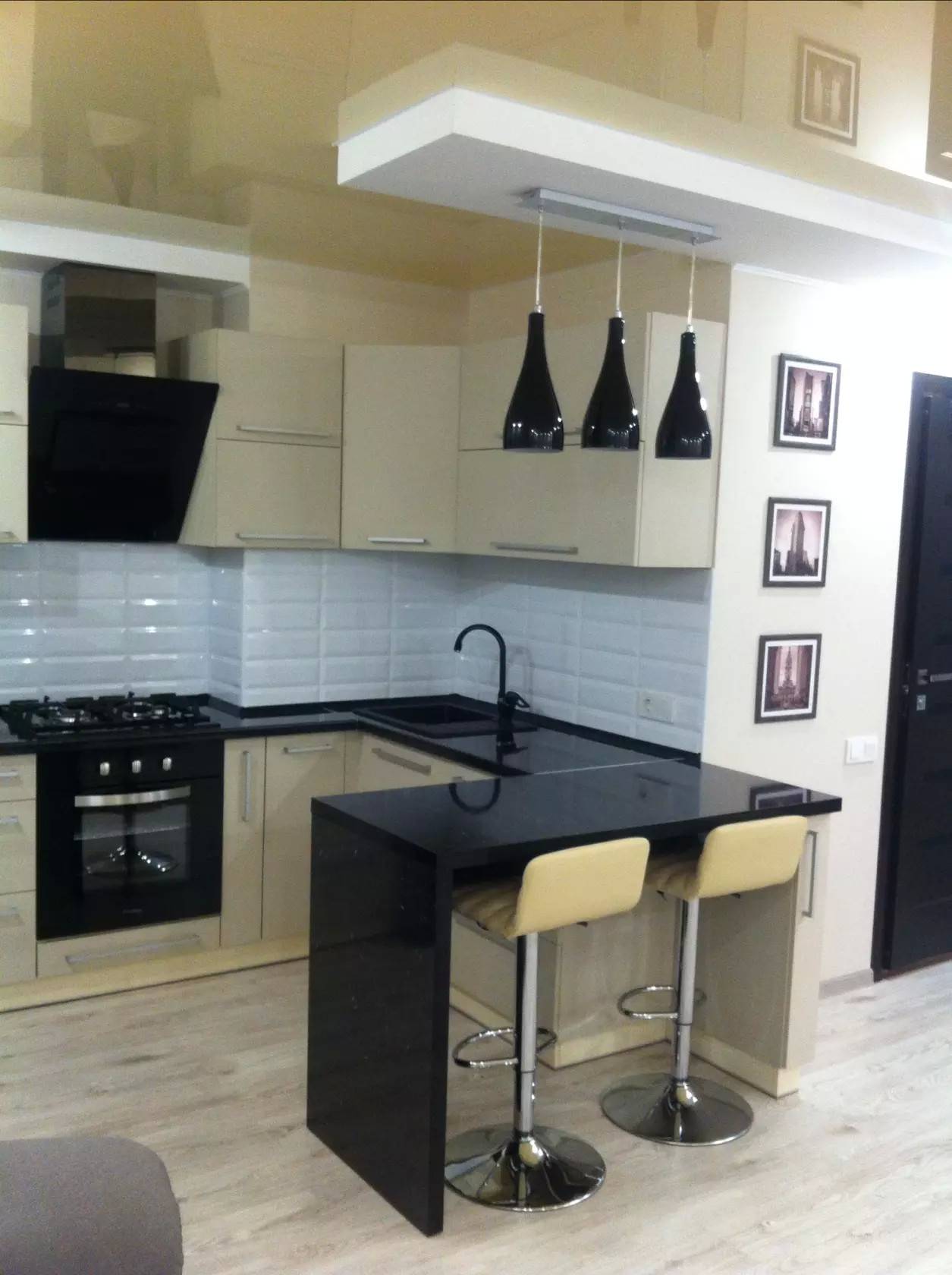 Дизайн маленькой кухни 2021 года, допускает соединение с гостевой комнатой, так можно размыть миниатюрные размеры. Это решение создает впечатление современности.