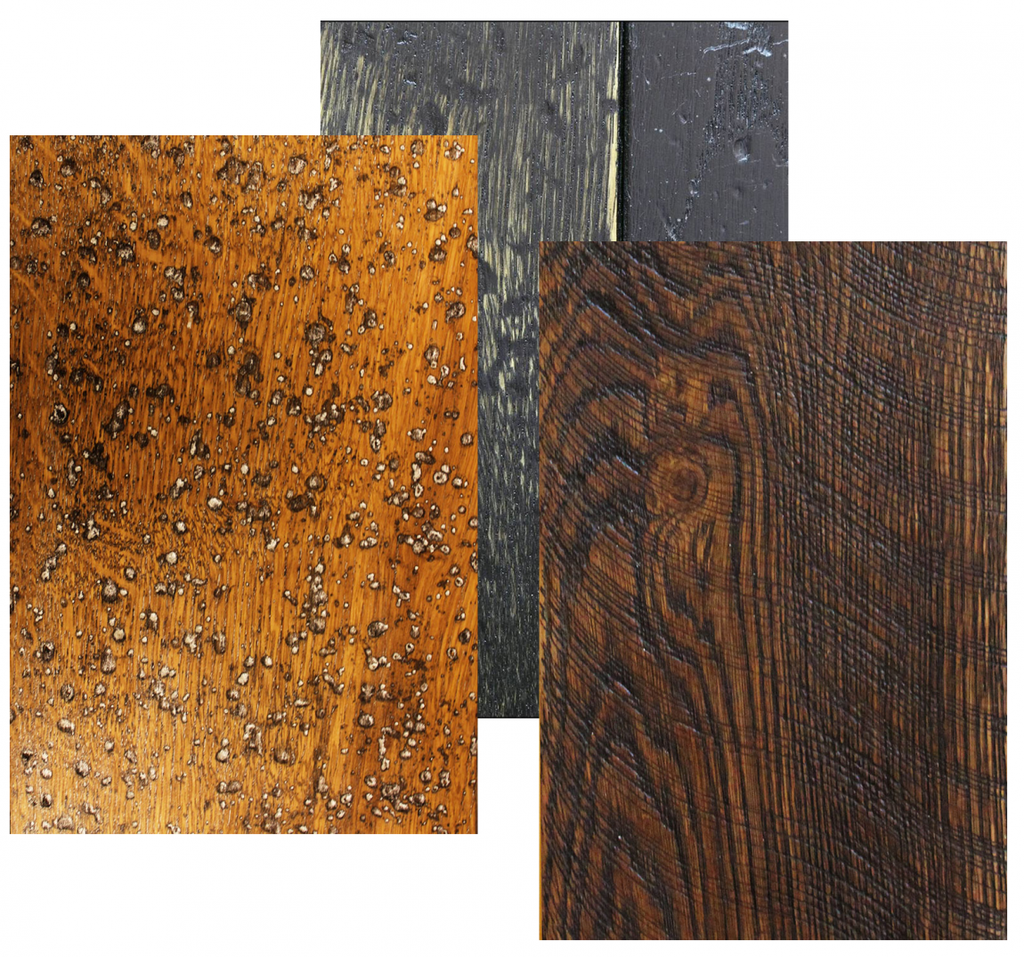 - Браширование – состаривание поверхности. Изделие обрабатывается металлическими щётками, позволяющими выбрать мягкую древесину годичных колец. В итоге получается рельефная поверхность, словно состаренная временем. С этой же целью используется пескоструйная обработка.