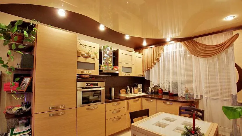 Конечно, выглядят они непревзойденно, однако оттереть капли жира над плитой после «бурной» готовки будет проблематично. Если же вы все-таки хотите установить темный глянцевый натяжной потолок на кухне, то заранее следует побеспокоиться о качественной вытяжке над плитой и о специальных моющих средствах для такого вида полотна.