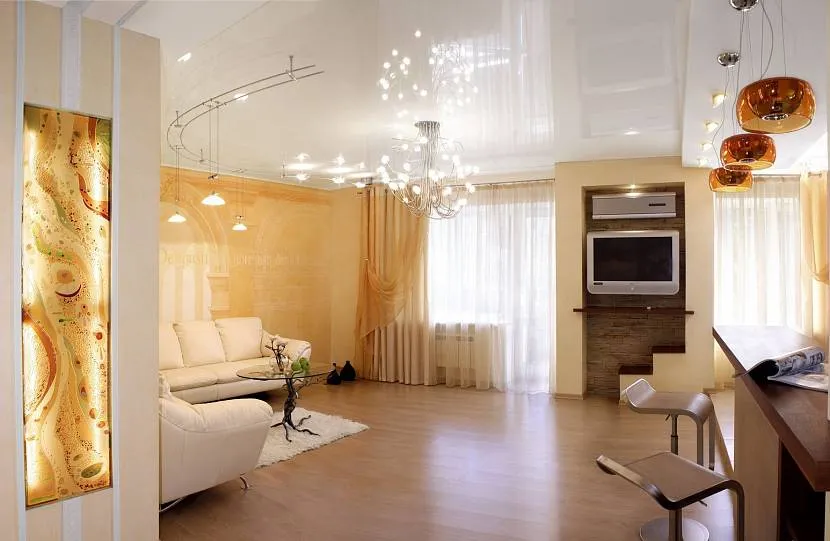 В гостиной можно монтировать любой потолок, ориентируясь только на визуальные ощущения. В этой комнате никто не спит и сильно долго не находится. Поэтому, если вам нравится глянцевый блеск – ставьте.