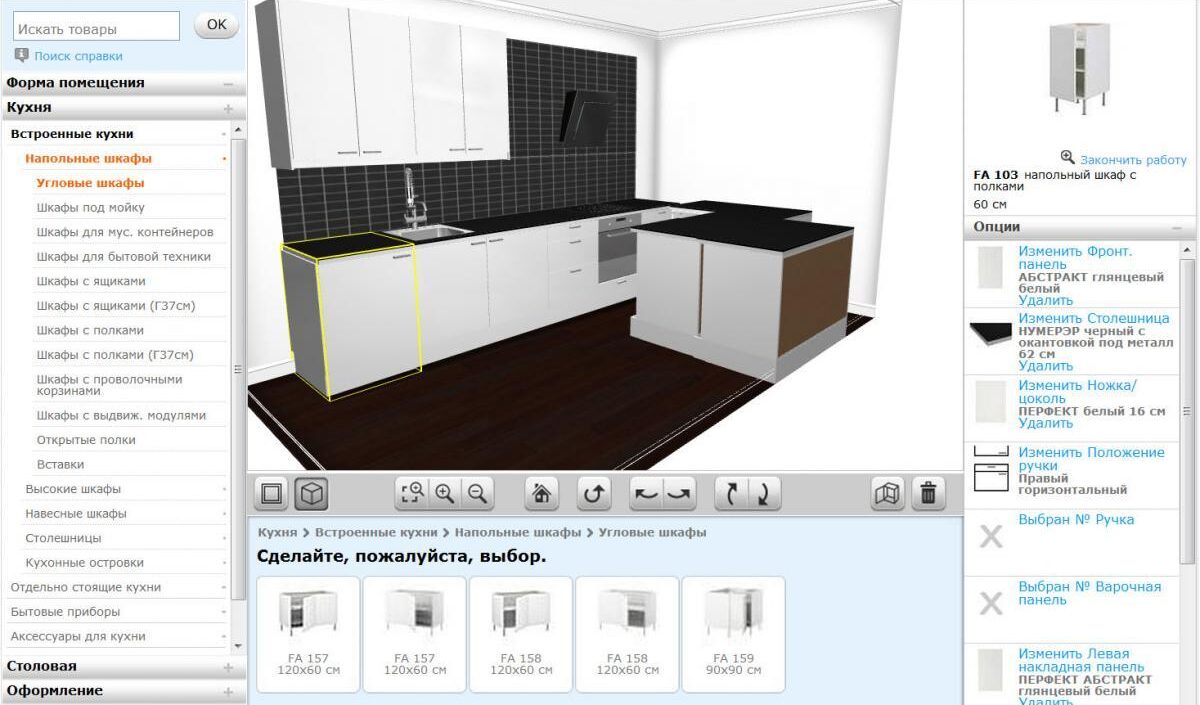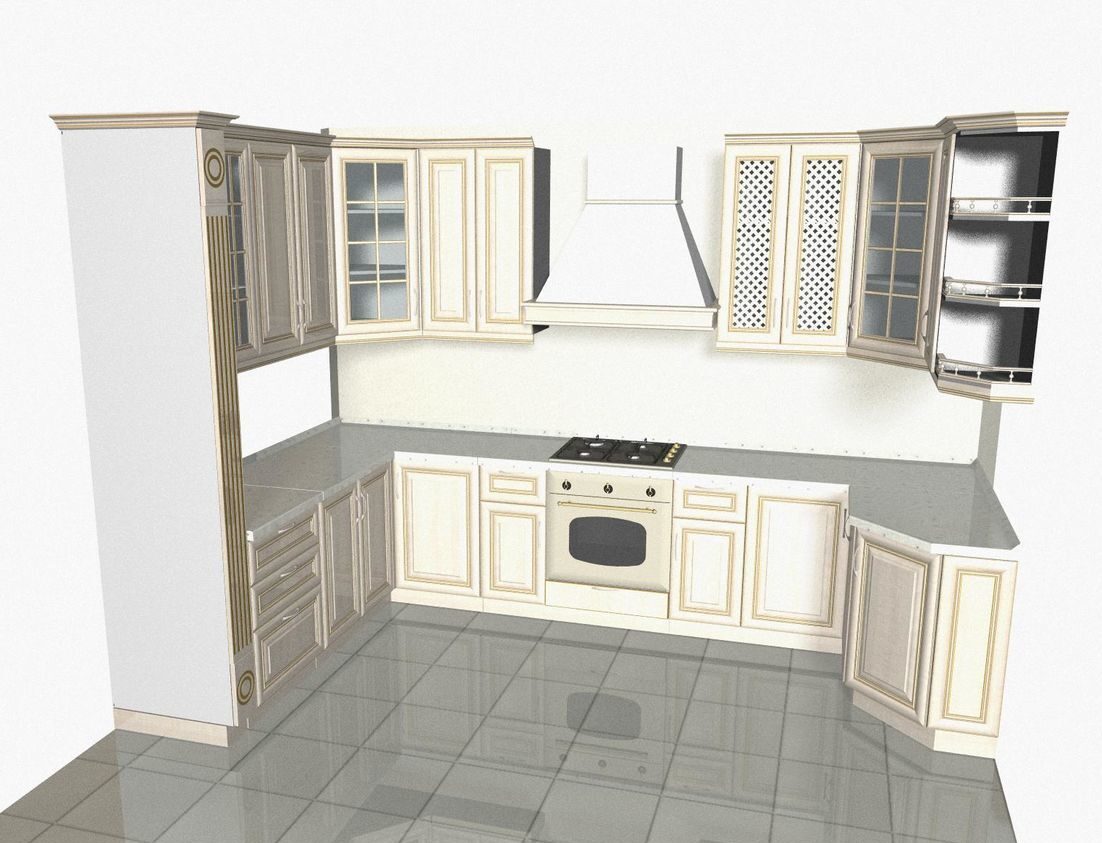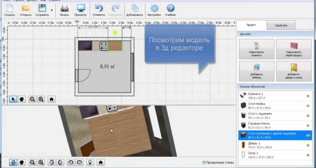 Открыв режим моделирования, удастся воссоздать комнату любой формы. В софте присутствуют не только различные корпусные объекты, на кухню можно добавить плиту, холодильник и т.п. Разрешено пользоваться длинномерными элементами.