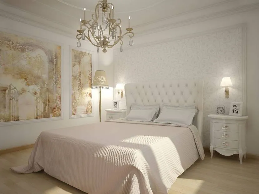 Самым популярным цветом для оформления классических спален является белый. В сочетании с другими светлыми оттенками получается невероятно красивый и роскошный интерьер.